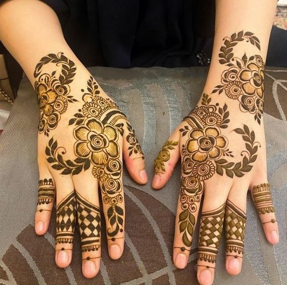 Popular modern bridal mehndi designs for the back of the hand include geometric motifs, Aztec-inspired patterns, and fusion designs that mix traditional elements with modern lines. Some brides even incorporate the groom’s initials or a shared hashtag for a personalized, contemporary touch.